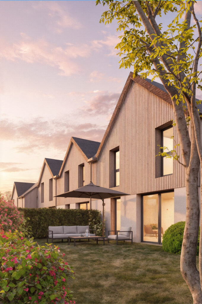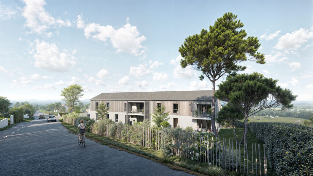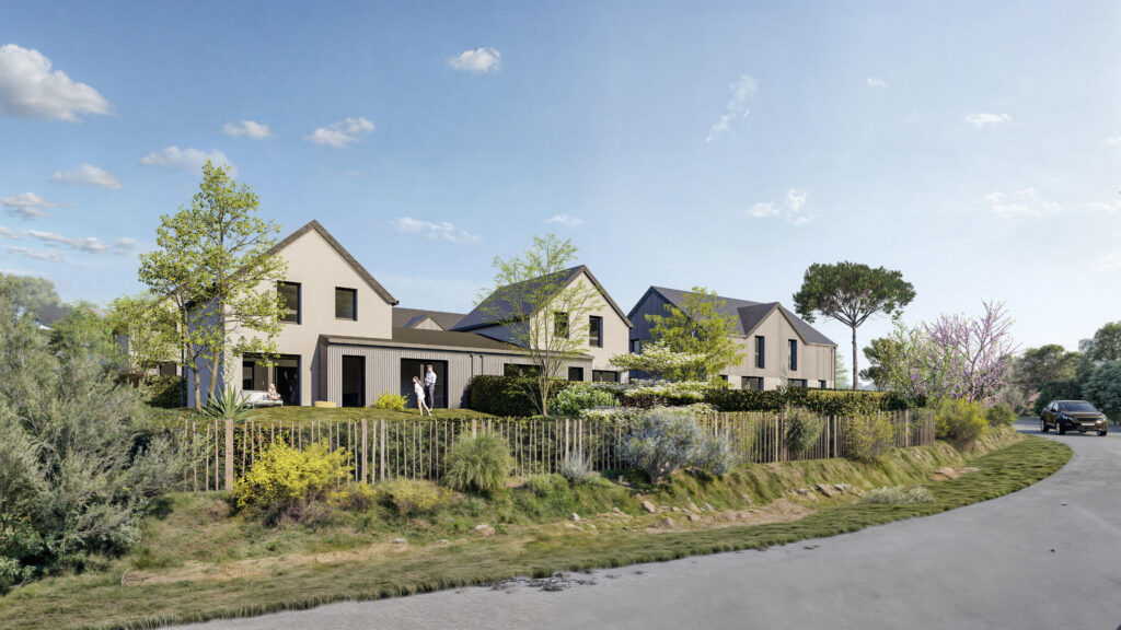 Chaque détail est pensé pour renforcer cette identité côtière. Les pergolas en bois sur le bâtiment collectif créent des jeux d’ombres et de lumière, tandis que les clôtures en ganivelles de châtaignier délimitent les jardins privatifs avec légèreté et transparence. L’architecture est sobre, durable et sensible, privilégiant les matériaux biosourcés et une haute performance énergétique pour s’inscrire dans une démarche environnementale respectueuse.