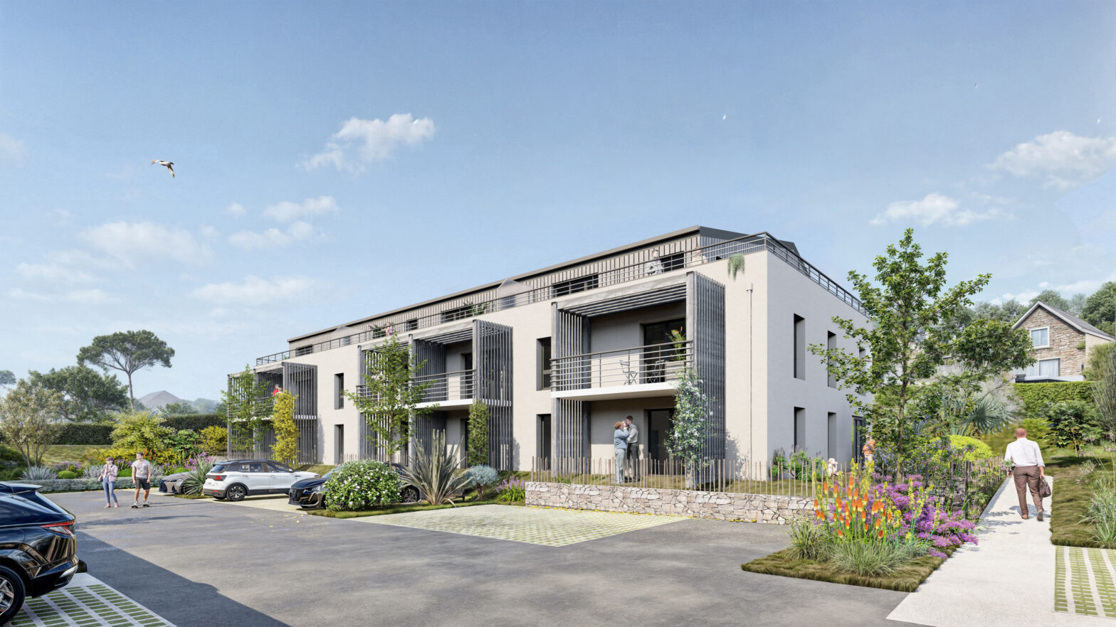 Le paysage est ici le véritable liant du projet. La forte déclivité du site est mise à profit pour étager les constructions, créant des « jardins-balcons ». Cette disposition en gradins assure à chaque logement des vues dégagées et une luminosité optimale, tout en ménageant l’intimité de chacun.