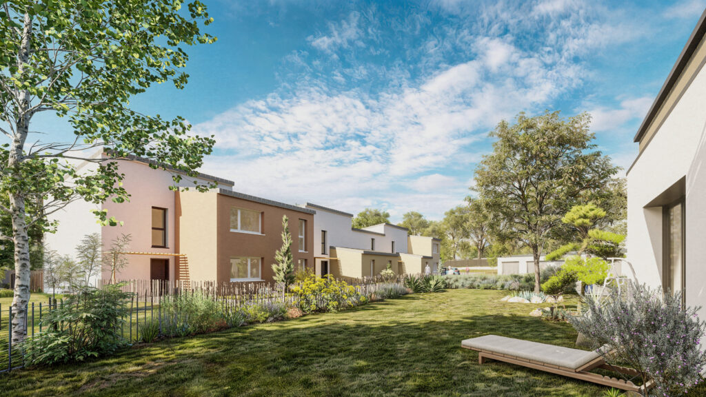 Les deux immeubles collectifs viennent se glisser entre les masses arborées, leurs volumes fragmentés et leurs façades jouant de reflets pour capter la lumière filtrant à travers le feuillage. Les maisons individuelles, quant à elles, s’organisent au nord du site, créant une transition d’échelle douce avec les habitations voisines. Elles s’articulent autour d’une cour conviviale, à la façon d’une villa urbaine, favorisant les échanges et le sentiment d’appartenance.