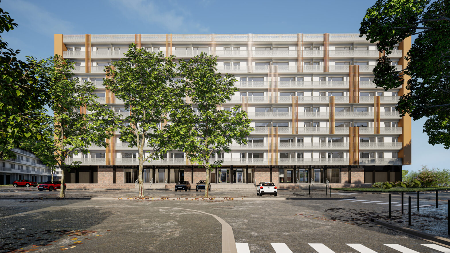 Sur le bâtiment C3, les balcons sont transformés : les anciens garde-corps en barreaux sont remplacés par des modèles en tôle perforée plus contemporains, et les extrémités sont habillées de tôle laquée. Sur la façade arrière, des cadres alvéolaires et un traitement en brise-vue vertical viennent animer la surface et casser la linéarité.