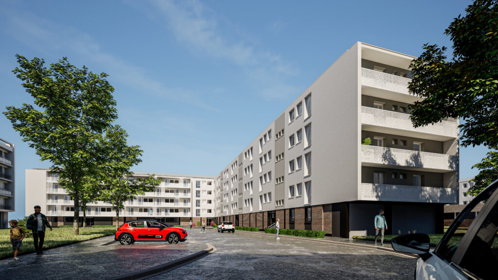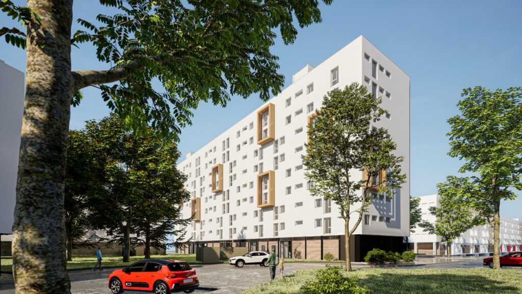 Pour l’immeuble F17, un jeu subtil de teintes (blanc et gris clair) redéfinit la lecture des volumes. Les fonds de balcons sont traités en gris clair pour créer un effet de profondeur, tandis que des bandes verticales de la même couleur soulignent les cages d’escalier et les sanitaires, apportant un élan vertical à l’ensemble.